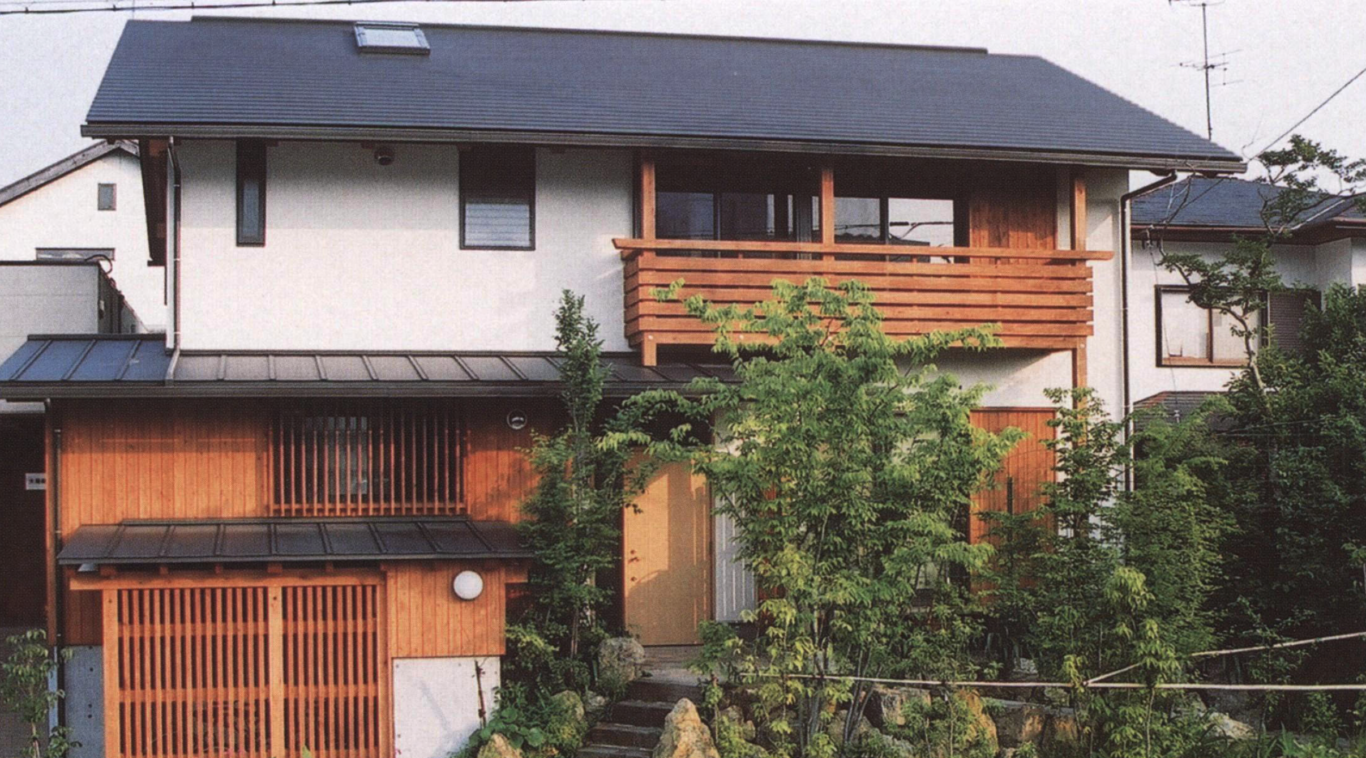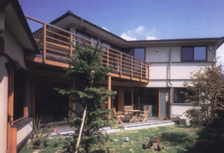 古い農家を建て直したもので、平家建て、深い軒に被われた縁先、来客を招じ入れる装置としての玄関の間など、日本の伝統的な家屋が持っていた良さをふんだんに取り入れた木造住宅である。そしてそれらが地元の職人の確かな手によってしっかりと造り上げられている。敷地の前を流れる川を意識して整えられた外観は伝統的な町並みをかもし出すことにも貢献している。この家に住む御夫婦と奥様の母親との3人という家族数のわりには広々とした食堂は同じ敷地内に住む息子さんの家族が夕食の度に集うところとなり、同じく深い軒空間を経て庭に面する広々とした居間は、しばしばお仲間が集う宴の場となるという。やや広めの廊下もそれ自体が収納スペースになっているだけでなく、同時にそこはお孫さんの読書のスペースにもなるように工夫されている。こうして家族が、友人が、仲間が集まることを可能にし、それを招来する家族空間が敷地一帯に実現されている。兼業農家であった御夫婦が、十分に満足できた、共に定年を迎えて後の暮らしの場として申し分のない建て替えであったとのことがしみじみと共感できる住まいである。