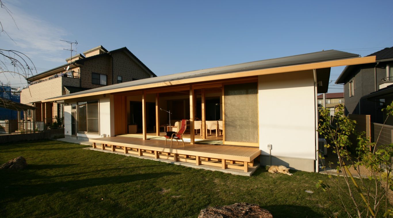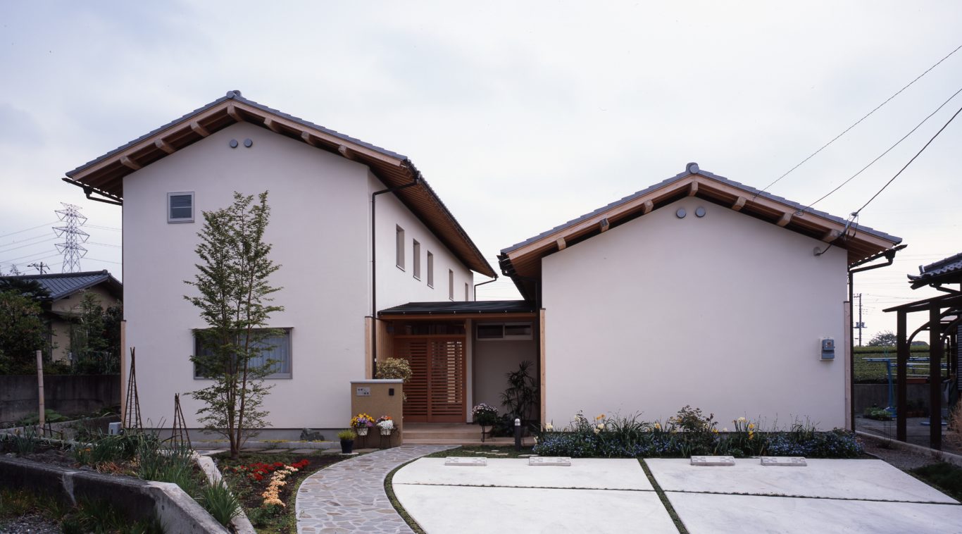 山裾の庵を想わせる小住宅。道路拡幅による建替えにあたって、住み慣れた場所での夫婦二人の生活を守るだけでなく、昔からの近所づきあい、背景となる山並み景観との調和など、地域との関係を大切にした住まいづくりが高く評価されました。道路側からは瓦葺きの平屋に見えますが、実は一部2階建て。2階にご主人の書斎と客間を兼ねた和室が置かれ、LOKや寝室、浴室は1階に集められています。ご夫婦が、互いの所在を感じながら自分の時間を楽しむことができる「ちょうど好い大きさ」です。また、将来を考え、日常的な生活は1階で済むように考えられていることも、長生きできる住まいづくりの要点のひとつです。天竜地区は寒暖の差が激しい所ですが、冬はパッシブソーラー(太陽熱)による床暖房、夏は深い軒下の広縁から吹き抜けへと風が抜けて気持ちが好いそうです。エアコンをあまり使わないので省エネ効果も高く、生活コストも抑えられています。環境負荷の少ない家づくりのモデルのひとつです。室内は地元天竜の木と白壁を主に構成され、奥様の好きな赤色に塗られた通気パイプやキッチンセットの扉が、アクセントとして彩りを添えています。また、玄関には高齢のご近所さんのための腰掛けが用意されています。昔ながらのご近所づきあいを大切にするご夫妻の心が感じられます。