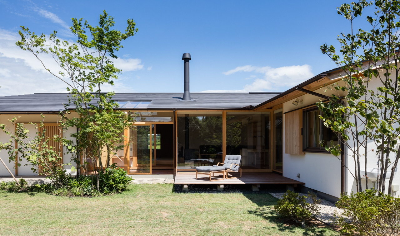 素晴らしい家を創るには、どの様にしたら良いかが提示されており、手本となるような住まいである。施主と設計者との熱心で綿密な打ち合わせ、この家ならではのデザイン提案や施工者の工夫等が、現地審査時に、楽しんで説明された住まい手から強く伝わってきた。優れた諸点は、平屋建てを活かしたコンパクトで綺麗に整頓された室内空間、家族のライフスタイル実現のために創られた、造付ソファー、掘り込み式畳ダイニング、リビングから子供室まで見渡せるキッチン、ウッドデッキ等の提案、寝室や家事室からも眺められる北側の小さな庭、母屋・中庭・車庫からなる敷地の高低差を利用した程良いスケールの外部空閻等である。大切かつ綺麗に使われているこの住まいは、四季と一緒に暮らせる居心地の良い、一つの理想的な家の在り方を提示している。