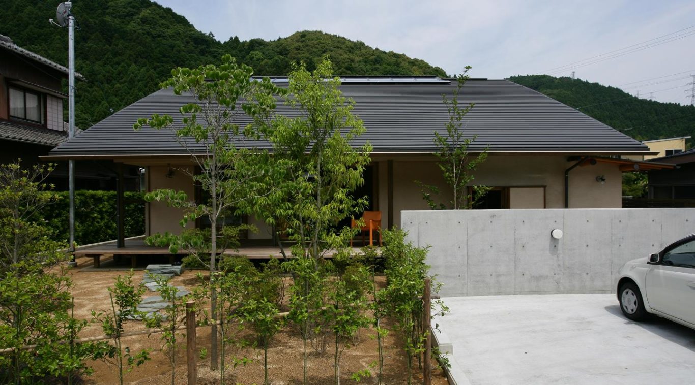 山裾の庵を想わせる小住宅。道路拡幅による建替えにあたって、住み慣れた場所での夫婦二人の生活を守るだけでなく、昔からの近所づきあい、背景となる山並み景観との調和など、地域との関係を大切にした住まいづくりが高く評価されました。道路側からは瓦葺きの平屋に見えますが、実は一部2階建て。2階にご主人の書斎と客…