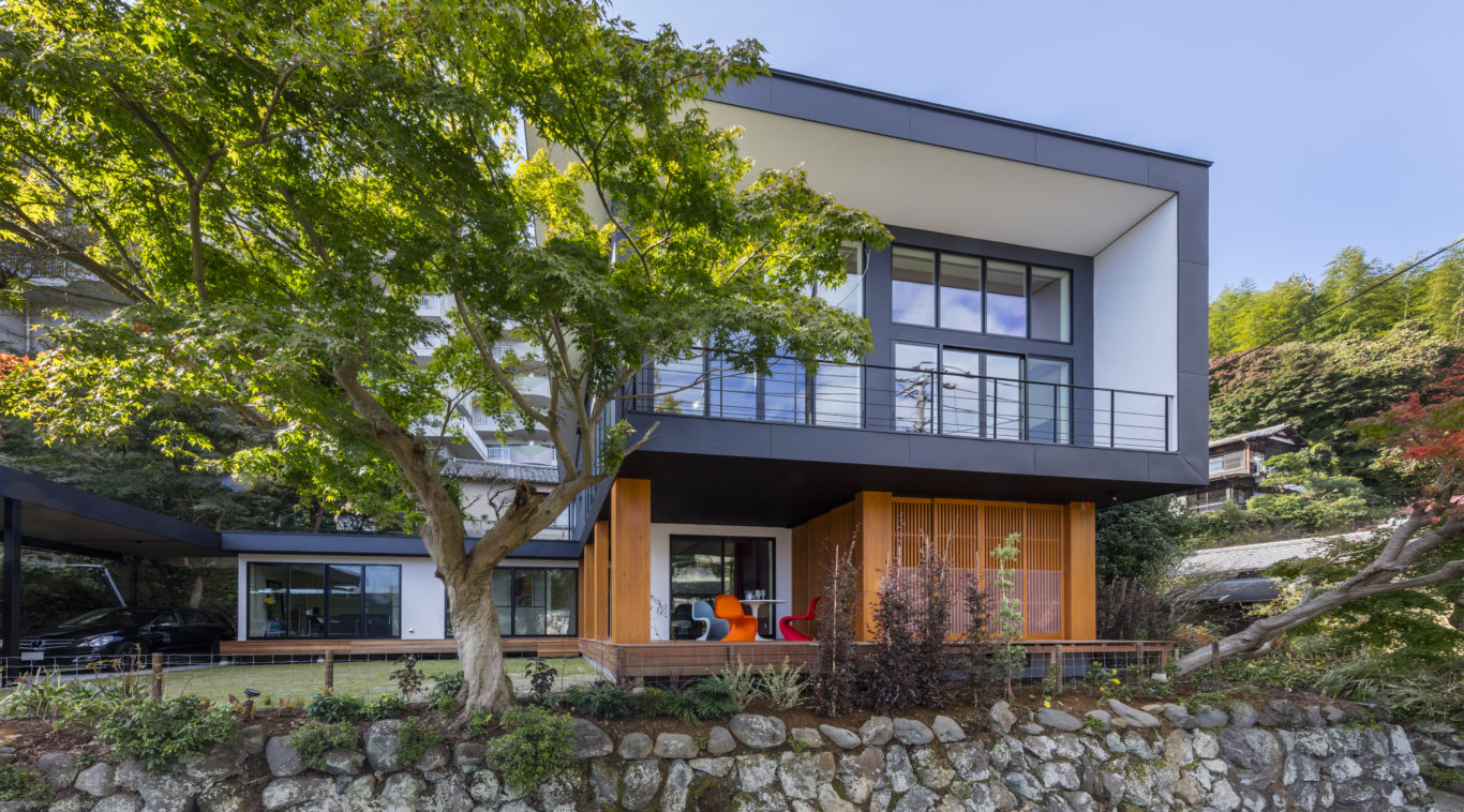 相模湾を眺望できる斜面地を活かした住宅である。また、施主がインテリアデザイナーであるという職種能力を遺憾なく発揮された作品でもある。取リ分け、内部空間を演出しているソファやテーブルなどの造作家具、照明、絵画などは、様々なところにバランス良く配置されている。各部屋に散りばめられた全8色のカラフルな色の…