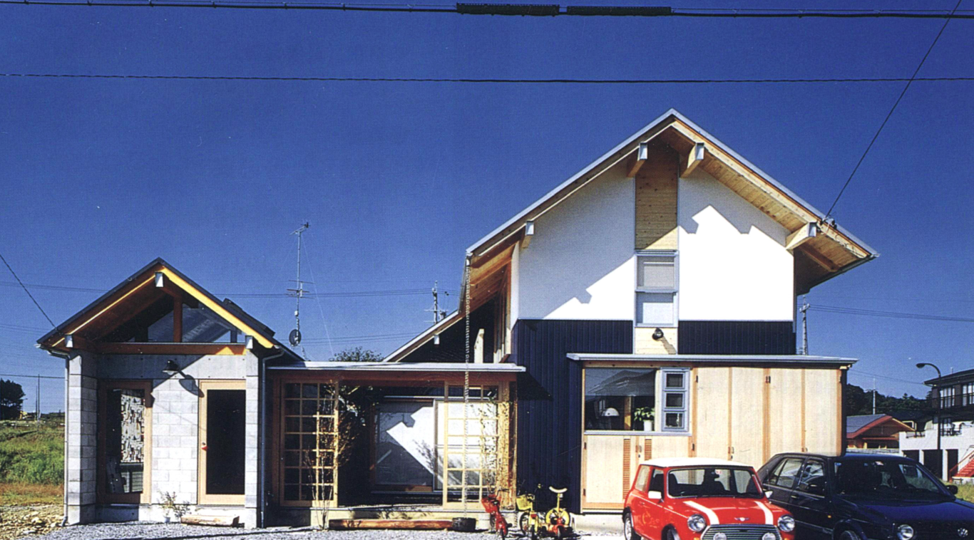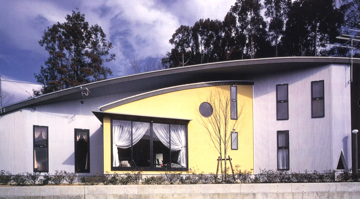 山裾の不整形な敷地に合わせた、特異な形態の住宅で、木造ながら曲面と複雑な立体構成をよくまとめ、施工したものです。内部には広々とした楽しい空間が展開しますが、そのボリュームを感じさせないつつましやかな外観です。この伸びやかに展開する空間に加えて、リビングダイニングの可変テーブルや、回覧板で町内にお知ら…