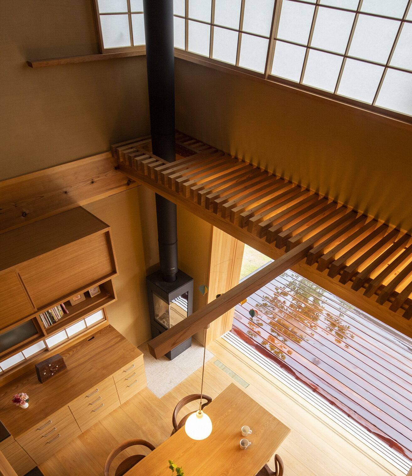 1階からロフトまでを吹き抜けにし、2階の大開口の窓から視界が広がるよう開放感を演出しつつ、薪を置く棚を庭に設けて目隠しに。開口部や天井の高さを工夫し家の断熱・機密性を高めたことで、1年を通じて風や太陽の温かさを感じられ、夏は涼しく冬は暖かく過ごせる。さらに、キッチンから外のデッキ、勝手口、収納庫を行き止まりのない動線で繋ぎ、家族の様子や窓からの景色を眺められる設計に。収納は、家事や身支度をスムーズに行える場所に適宜分散させた。「共働きのご夫婦が、家事や子育てを効率的に行えるように」と、自身も子育てをしながら働く女性建築士らしい、細かな気配りが散りばめられている。