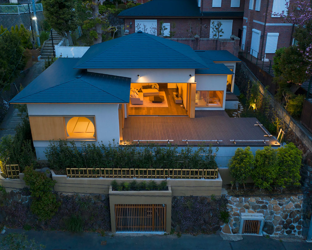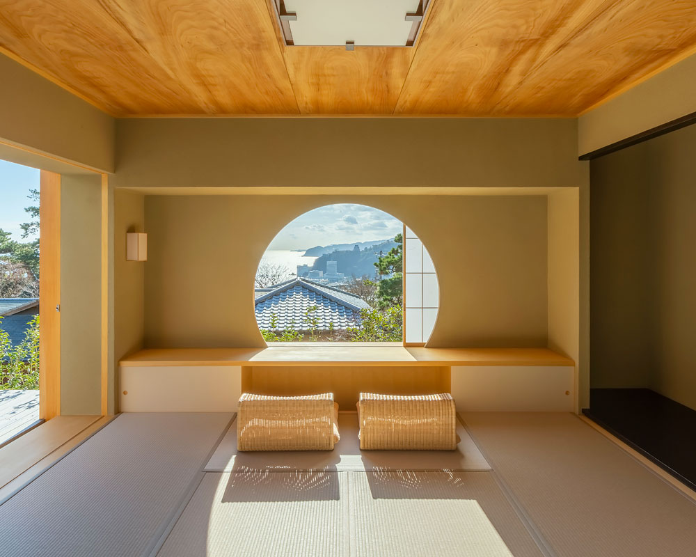 熱海は海と温泉が楽しめる、別荘地としても人気のエリアだ。その高台で、近隣には樹木が生い茂る閑静な場所に「一休庵」は建つ。一見シンプルな平屋ながら、とても手の込んだ造りになっている。この住宅を手がけたのが、沼津市に本社を構える「株式会社平成建設」。設計士の和知祐樹氏は、これまでにグッドデザイン賞を複数回受賞している、実力派だ。「この土地の主役は、熱海湾を望む『風景』です。建物はそれをいかに引き立てるかを考えて、設計しました。」と、和知氏は語る。家の中央に位置するリビングは、間仕切りがなく広々としており、大開口からは開放感たっぷりの景色を楽しめる。和室、寝室、浴室からも海が見える設計となっているため、温泉に浸かりながら海を眺められる。まさに熱海の良さを満喫できる、癒しの住まいだ。